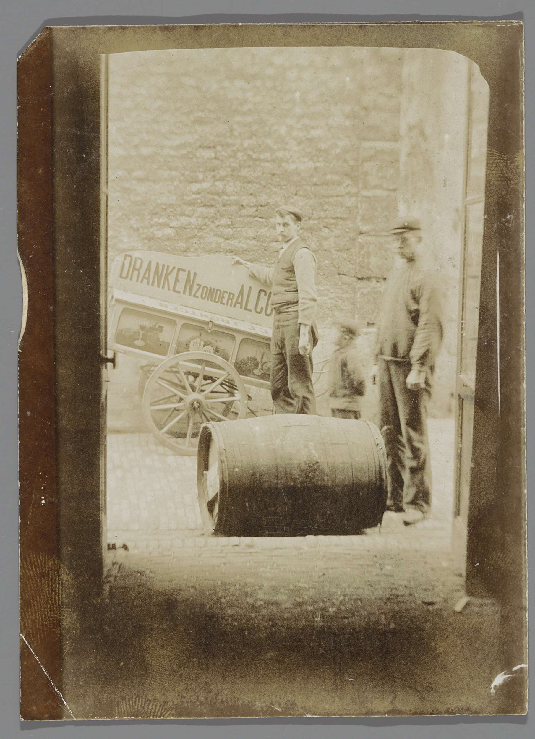 Arbeiders (vooraan Jan Vink) laden een houten vat bi...