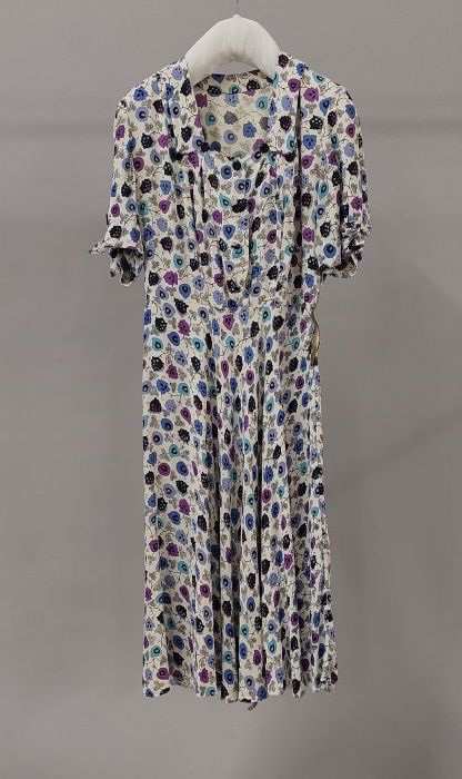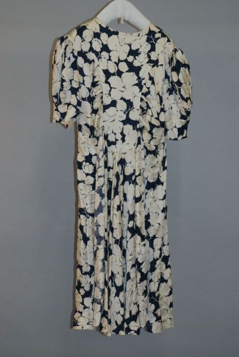 Donkerblauw/wit gebloemde middagjapon zonder kraag, ...