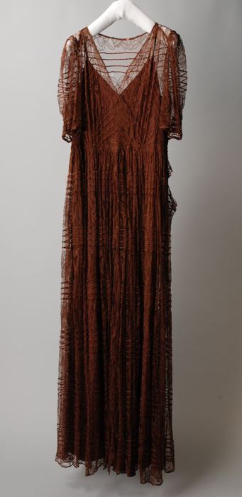 Bruine kanten avondjapon, korte mouw en V-hals met v...