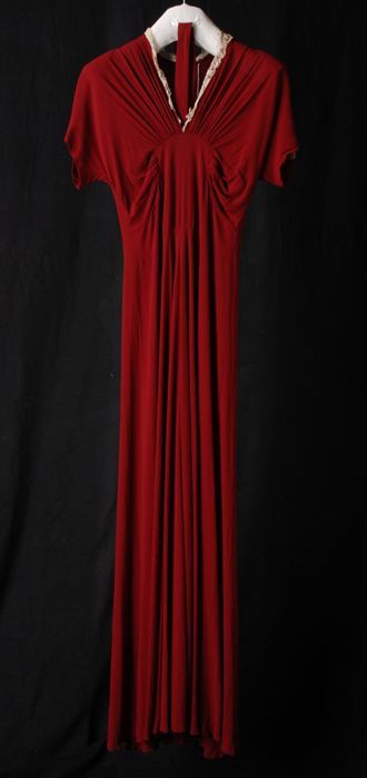 Wijnrode jurk met kant langs de hals en de korte mou...