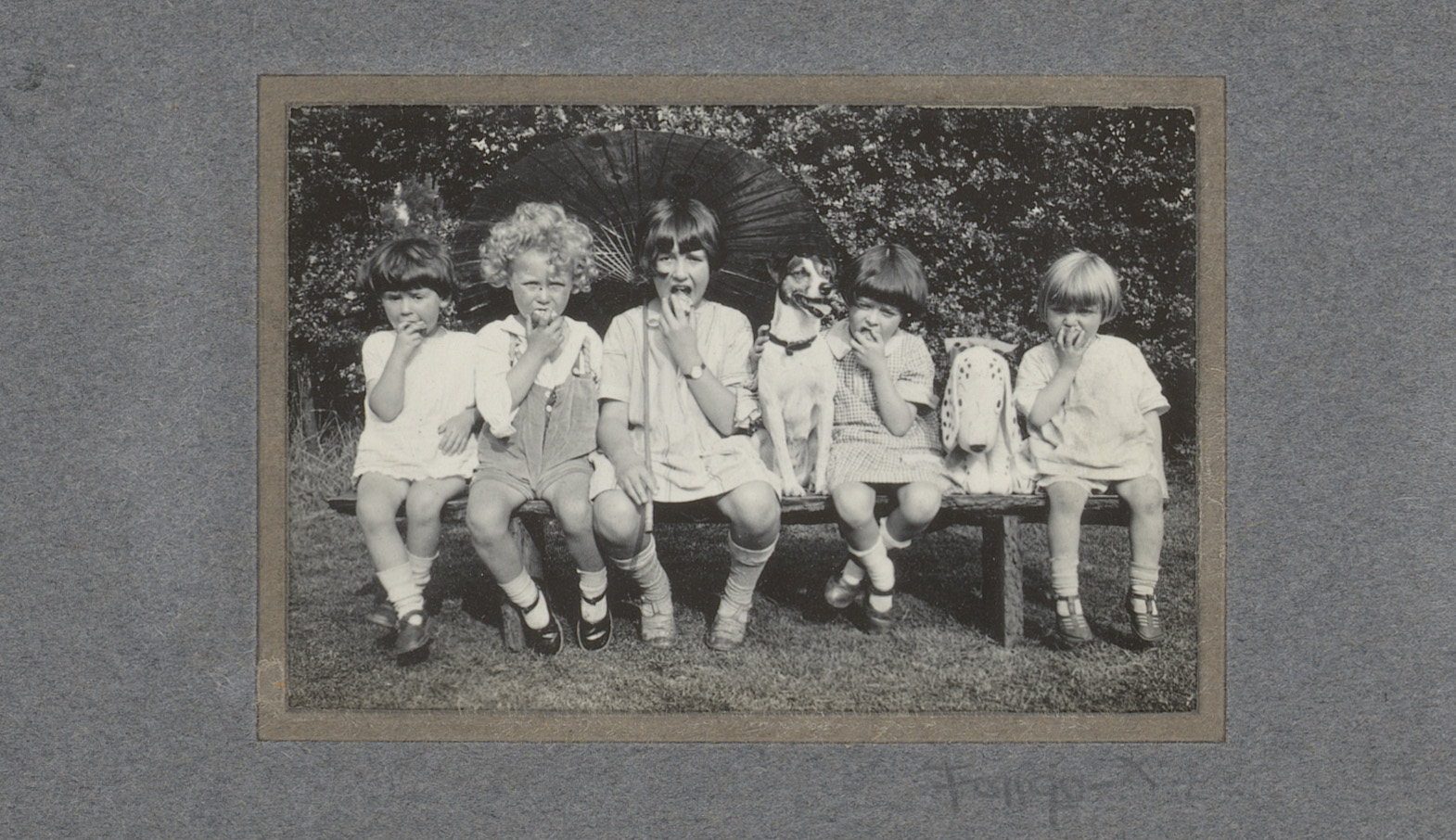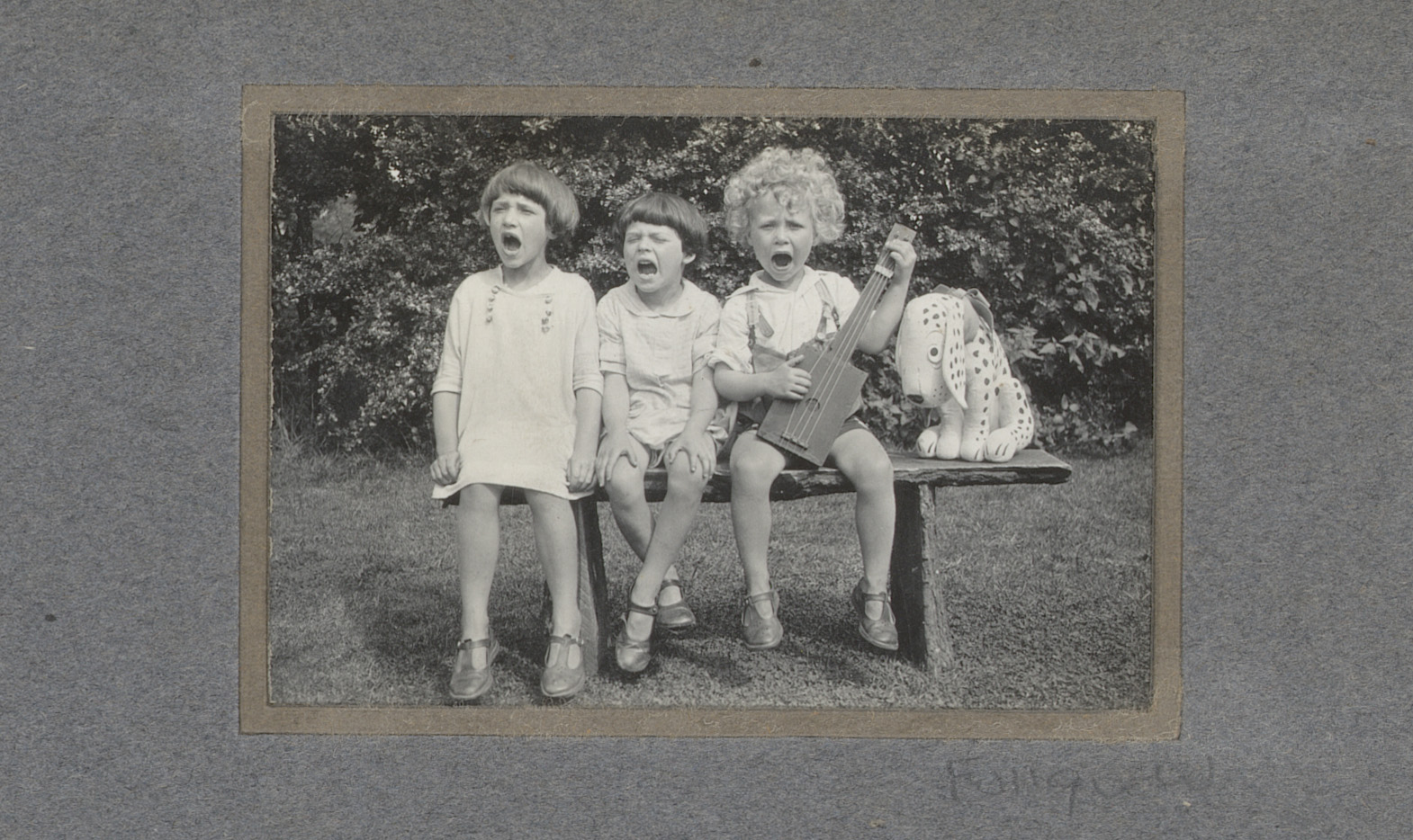 Zingende kinderen buiten, zittend op een bank
