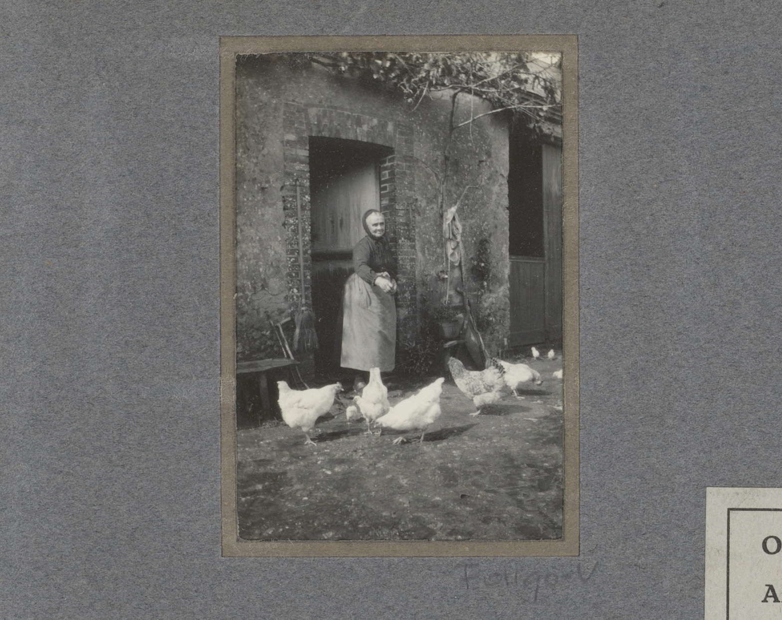 Vrouw in deuropening voedt kippen