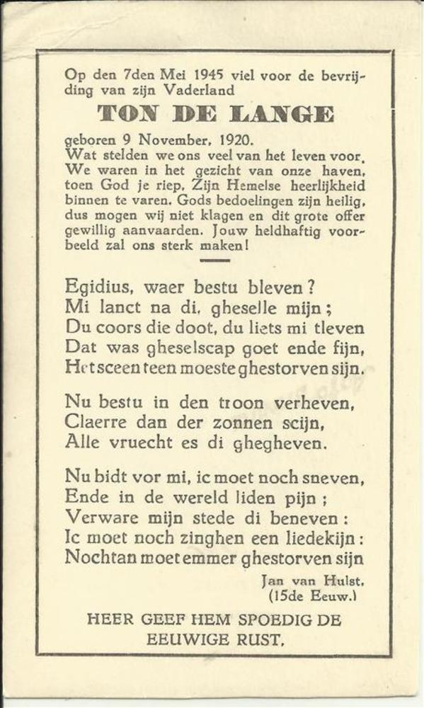 bidprent van Ton de Lange