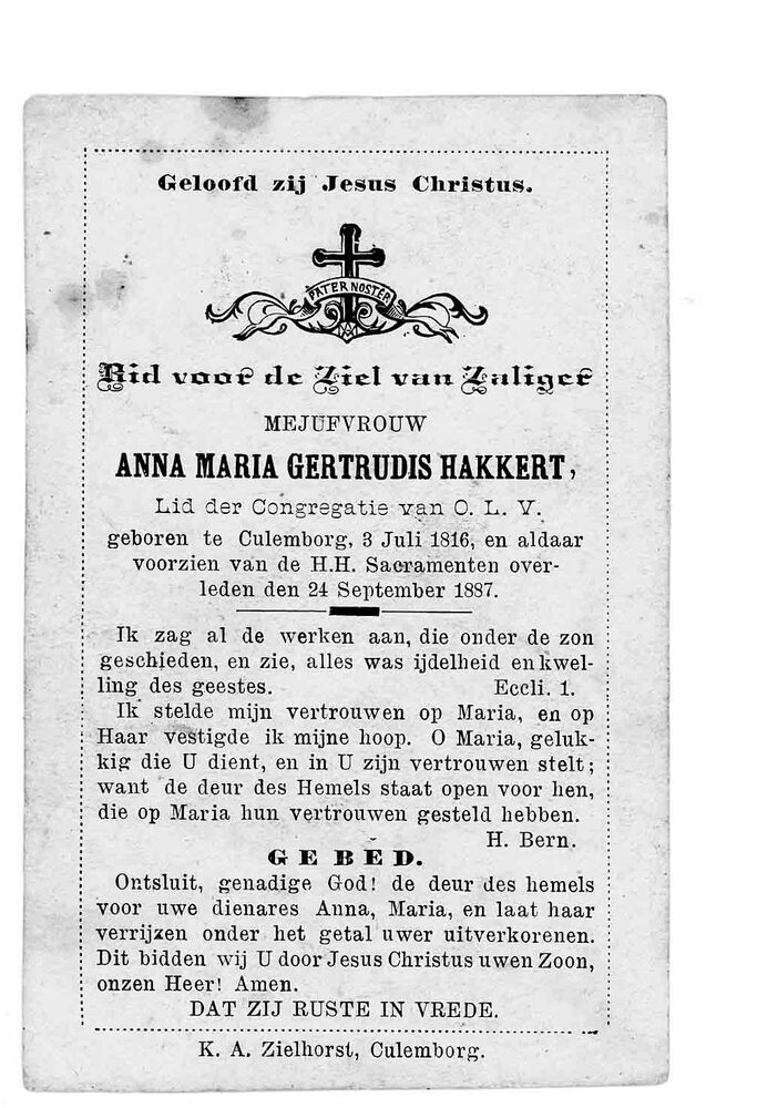 bidprent voor Anna Maria Hakkert. Geboren 03-07-1816...