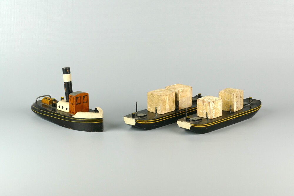 stoomsleepboot met dekschuiten van hout, 1930-1950
