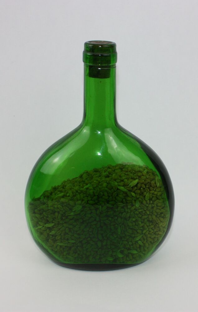 Ovale groene wijnfles gevuld met graan