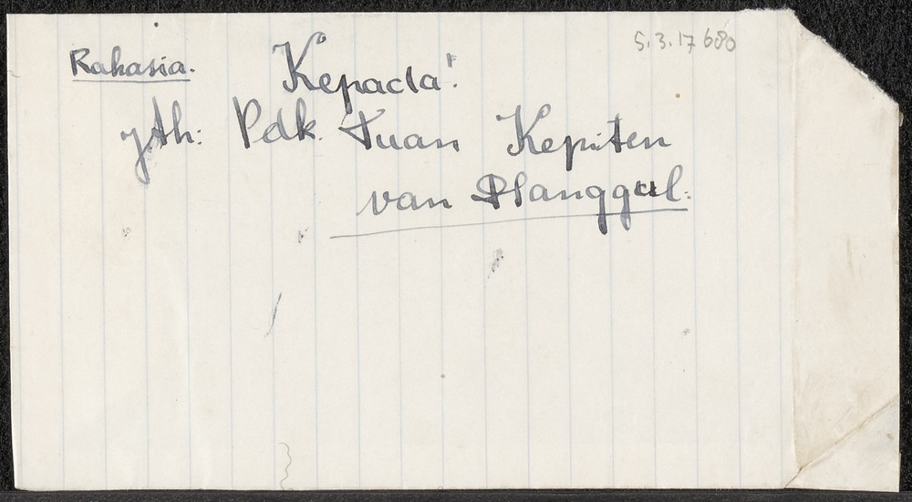 Handgemaakte en beschreven enelop, aan Pdk. Tuan Kep...