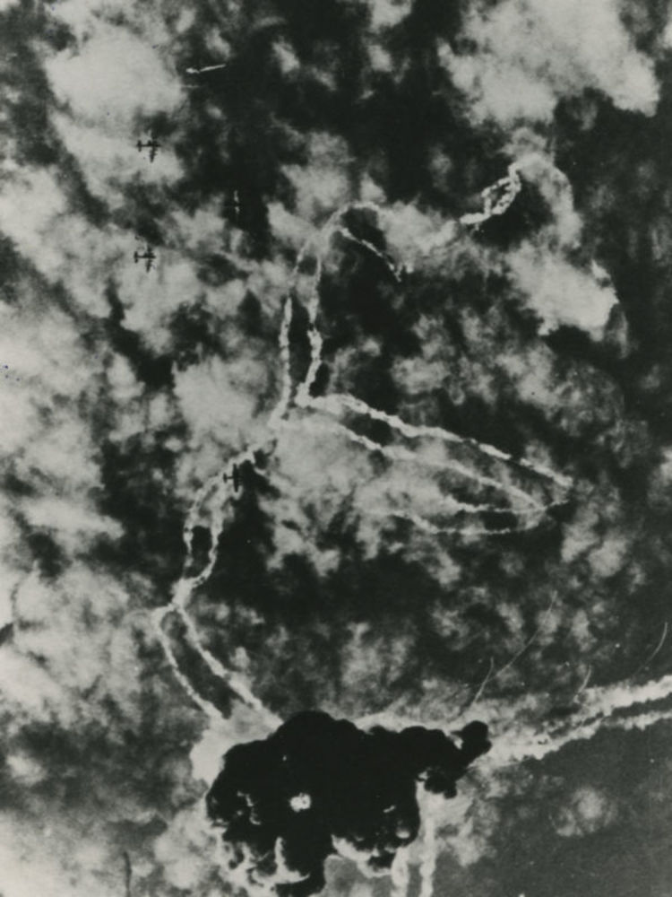 Foto van explosie in de lucht. Tekst achterop: "Eind...