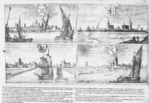 Gravure met afbeeldingen van Sloten, IJlst, Hindeloo...