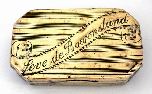 Tabaksdoos van messing met ‘Leve de Boerenstand’