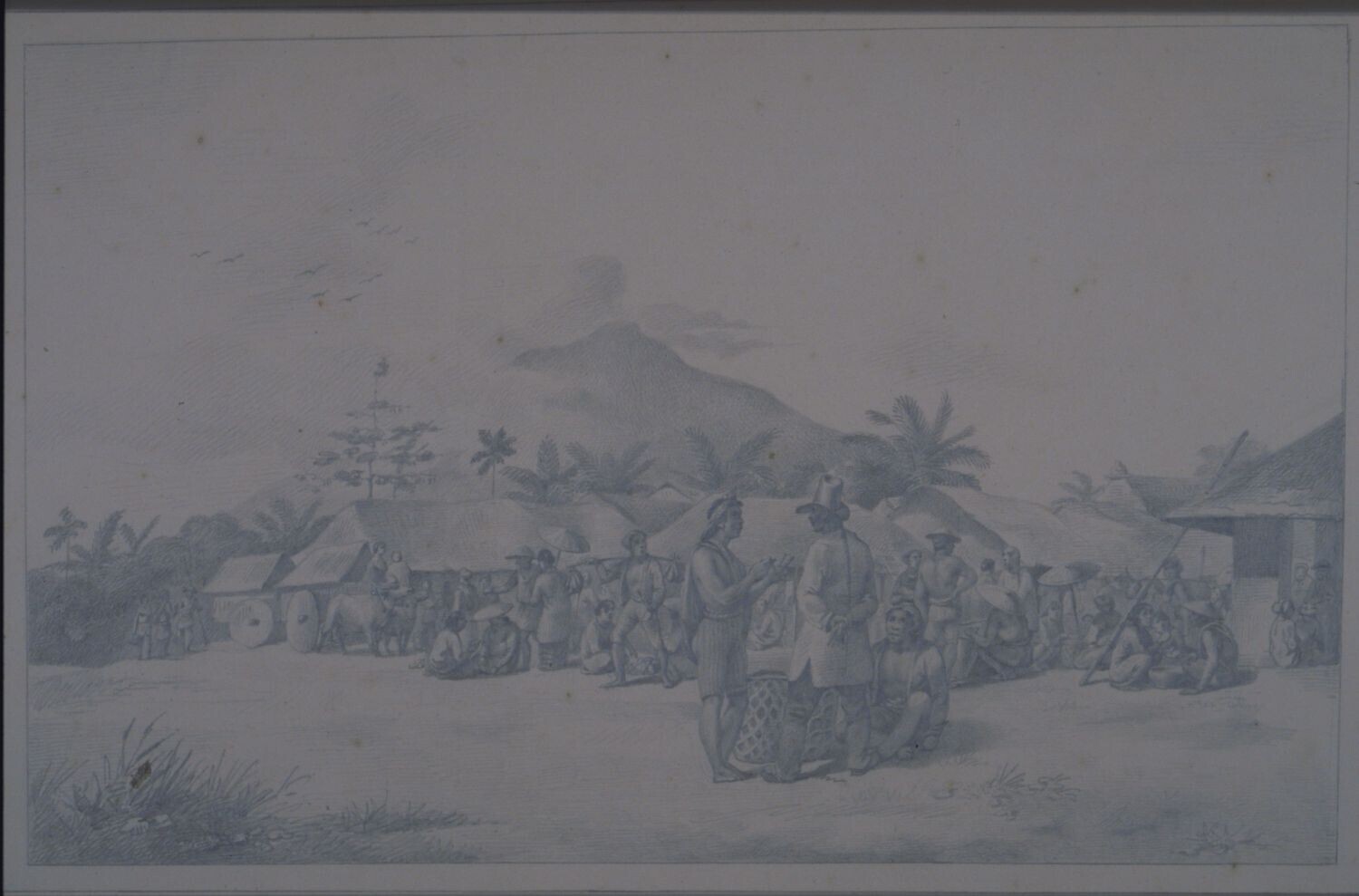 Buffels en Javanen in een nagebouwde kampong op de k...
