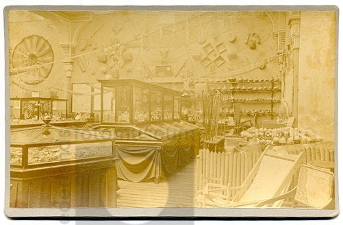 Interieur met vitrines en gebruiksvoorwerpen op kolo...