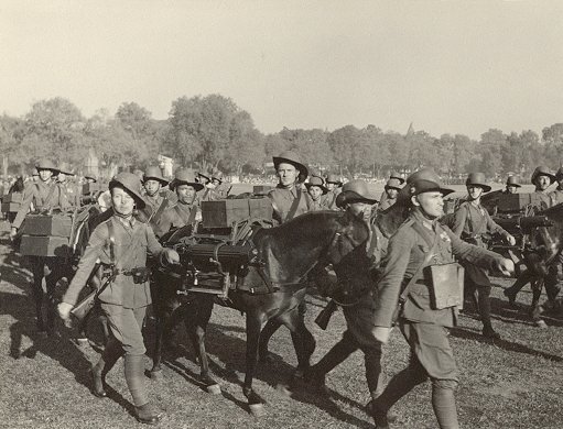 Vier achter elkaar marcherende Midden-Javaanse soldaten