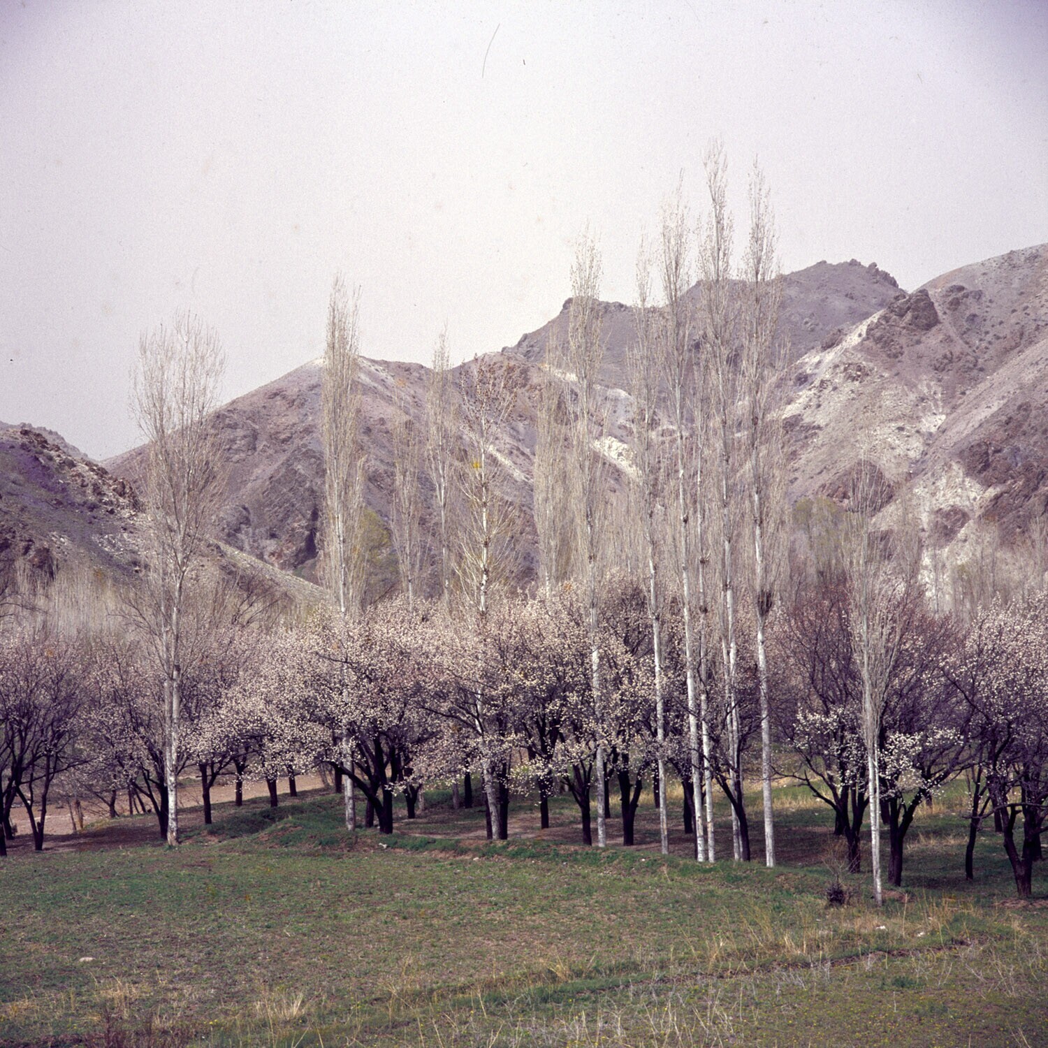Uitbottende bomen in berglandschap, Iran