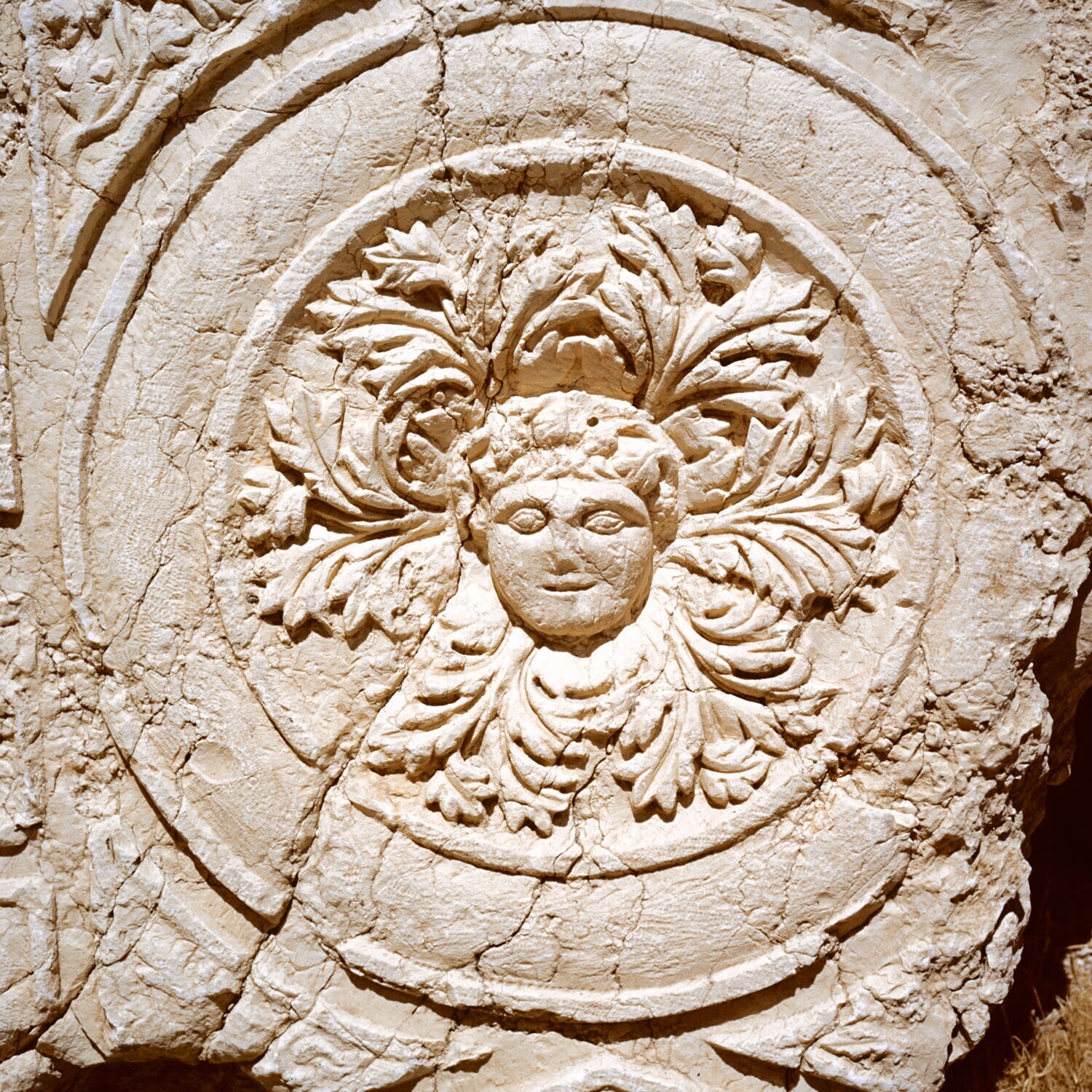 Detail van een reliëf van een vrouwenhoofd