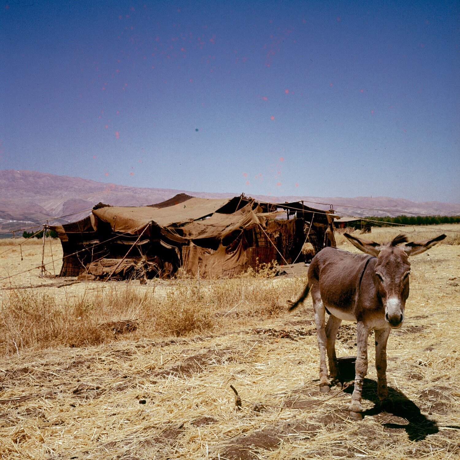 Een nomadentent met een ezeltje ervoor