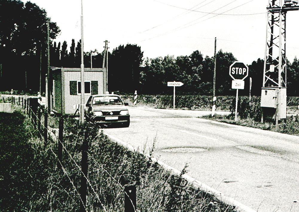 Zwart-wit foto van de tijdelijke grensovergang Elten...