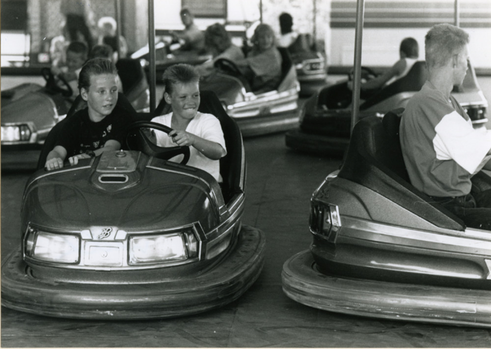 Zwart-wit foto van de jeugd in botsauto's op de kerm...