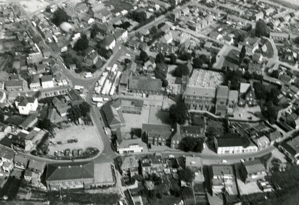 Zwart-wit luchtfoto van het dorp Lobith. ca. 1960-1990.