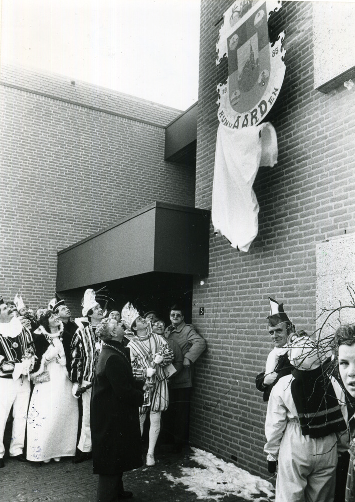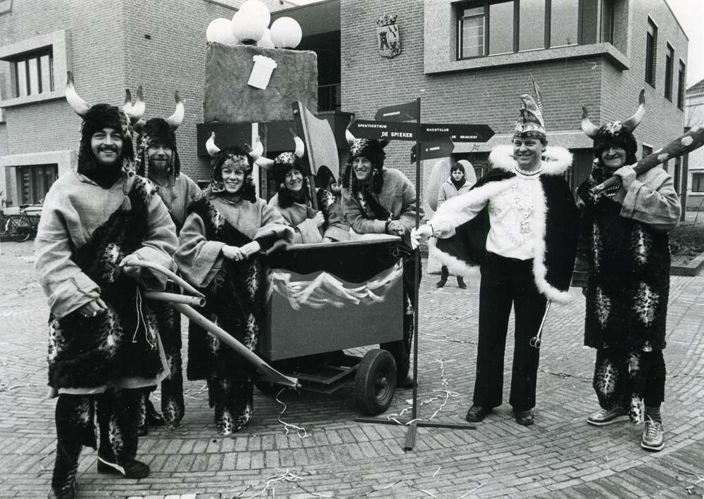 Zwart-wit foto van carnaval bij het nieuwe gemeenteh...