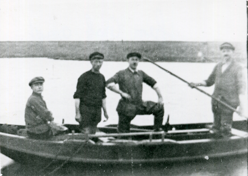 Zwart-wit foto van de familie Grob in een visserboot...