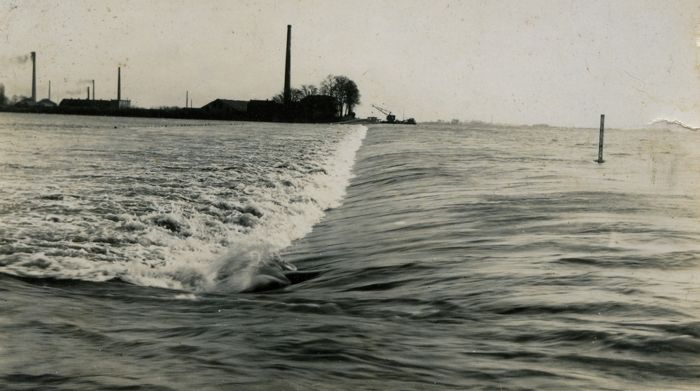 Zwart-wit foto van de wateroverlast in Lobith decemb...
