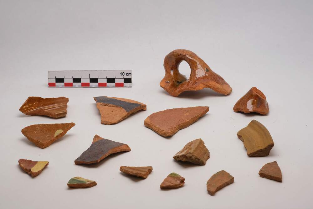 Fragmenten, baksteen/been/ijzer/aardewerk/glas,