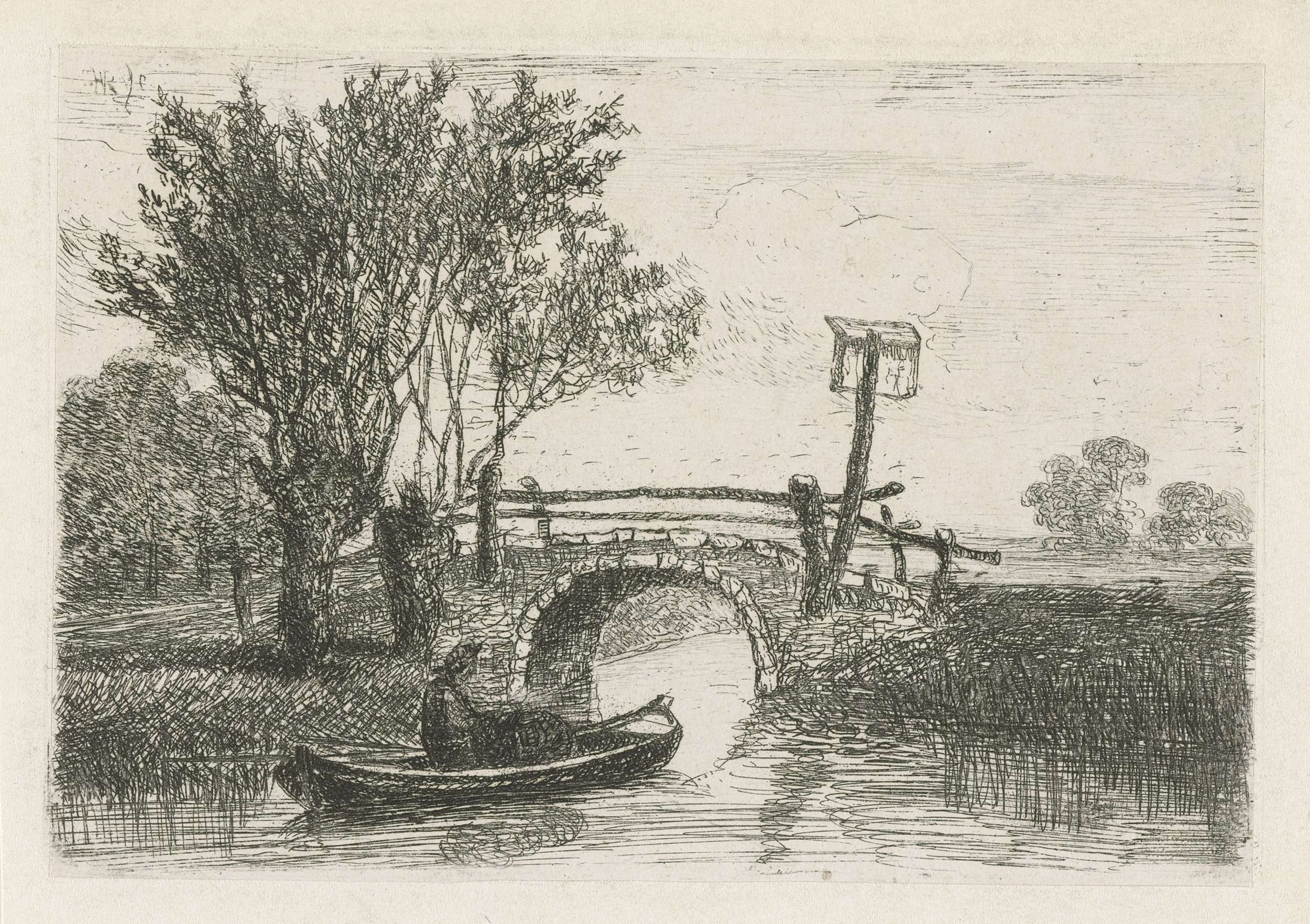 Man in een boot bij een stenen brug