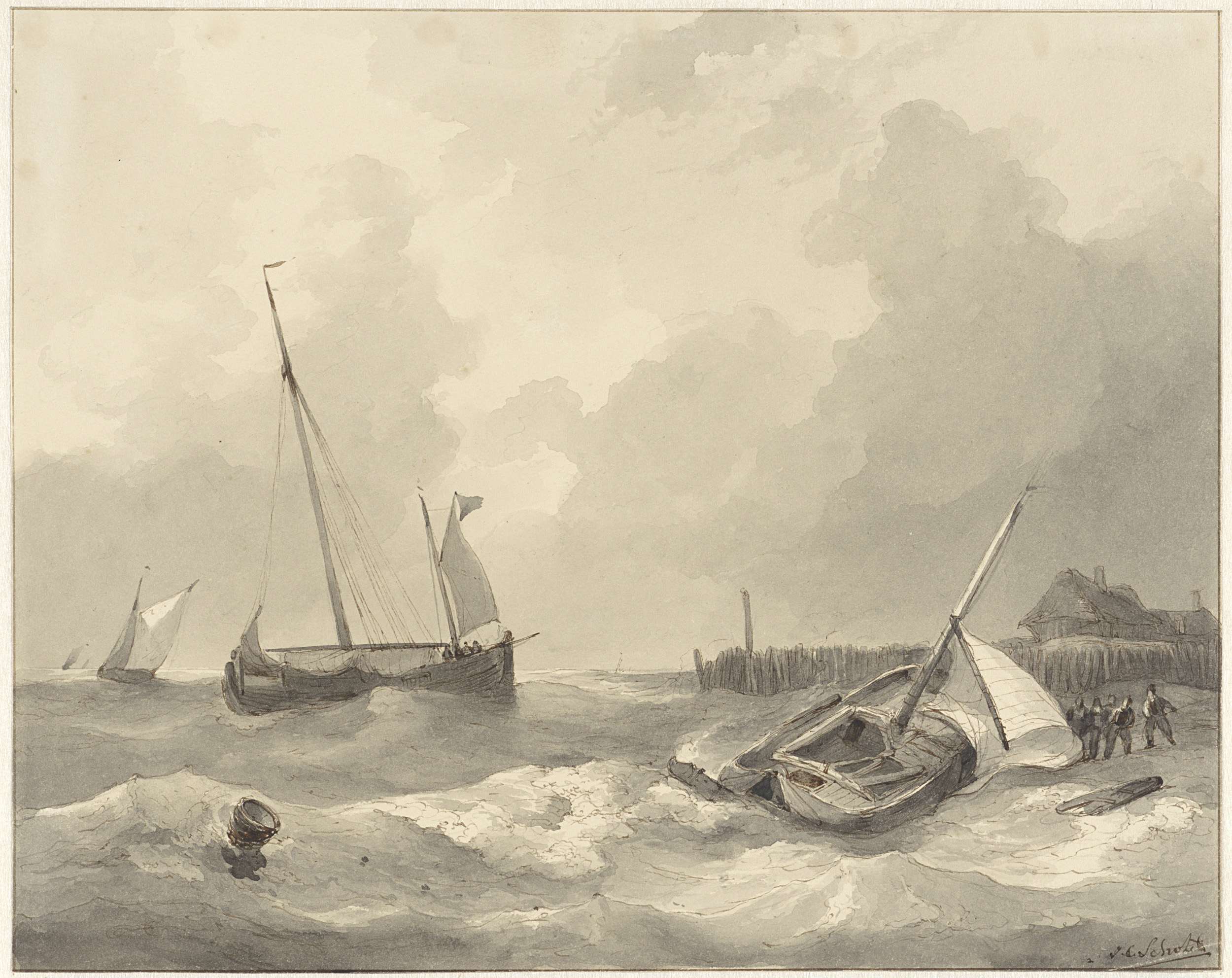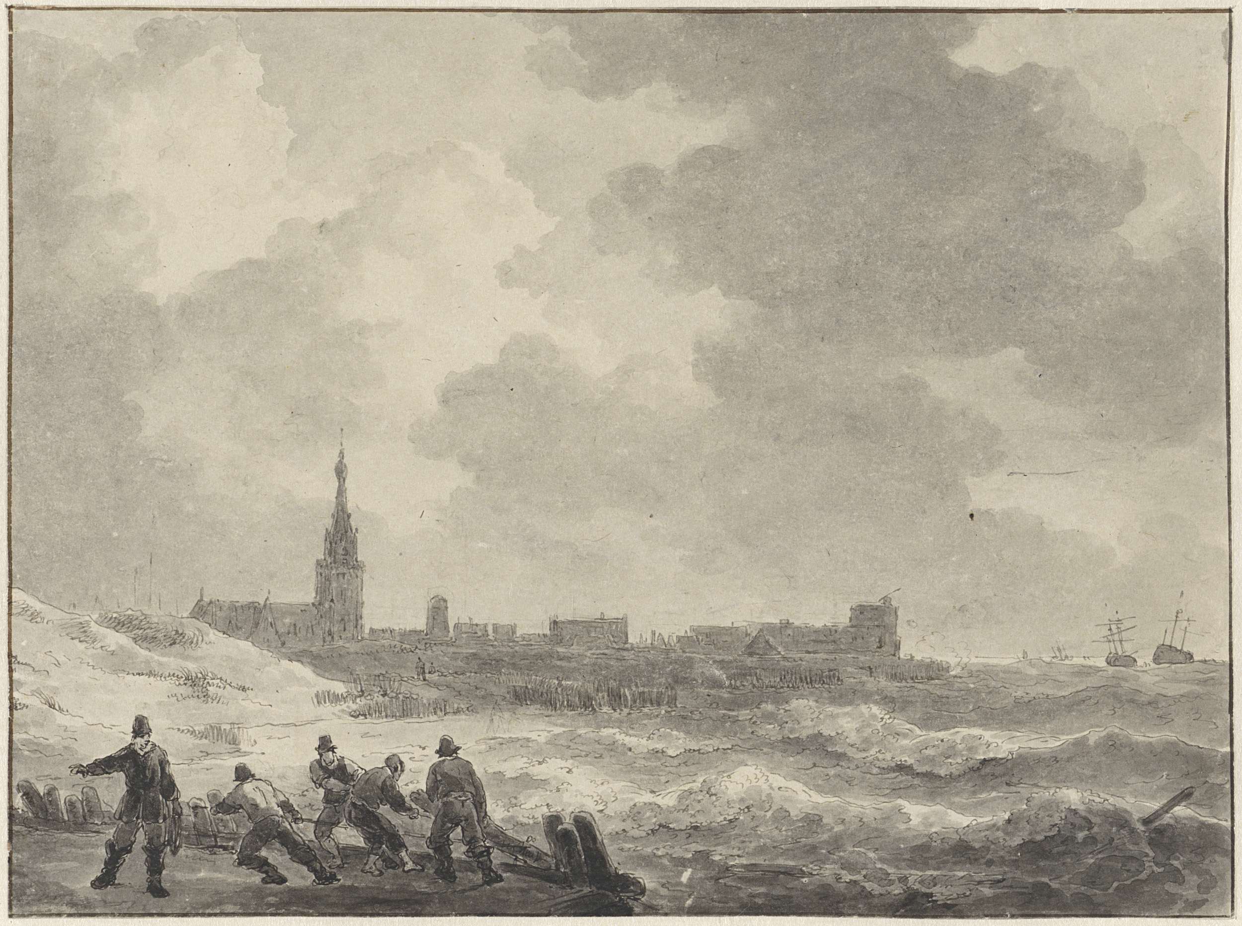 Kust met dorp en kerktoren (Scheveningen?), linksvoo...