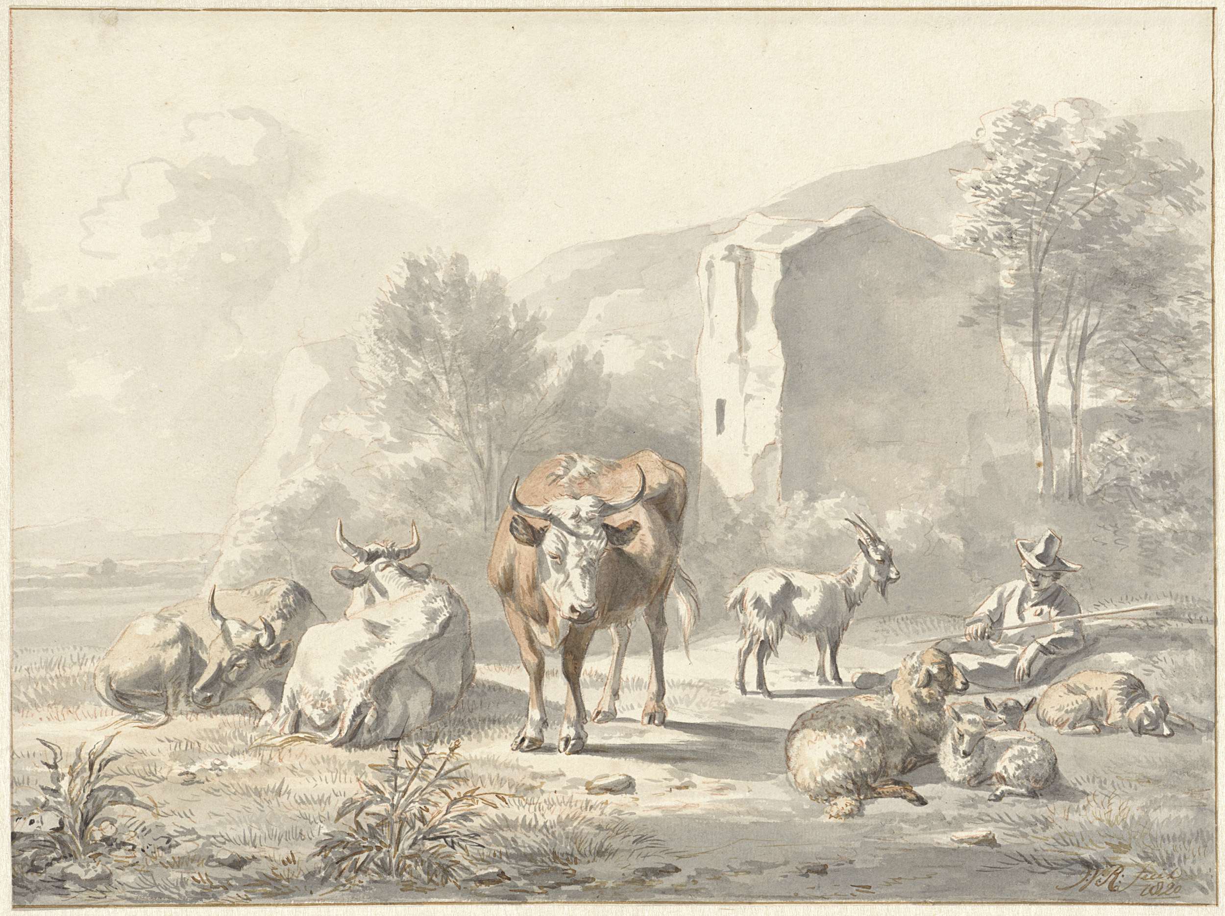 Landschap met vee en ruïne