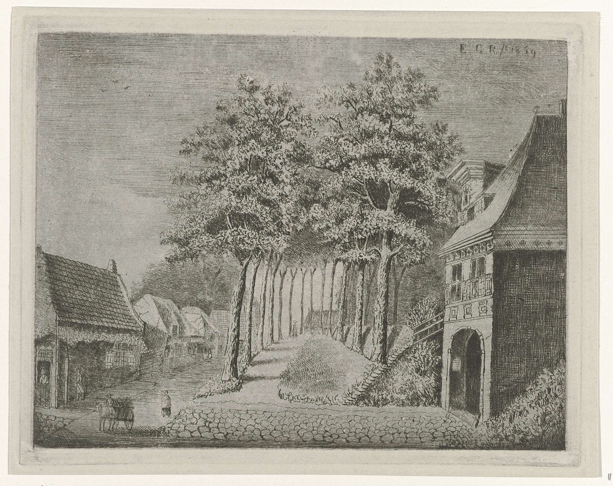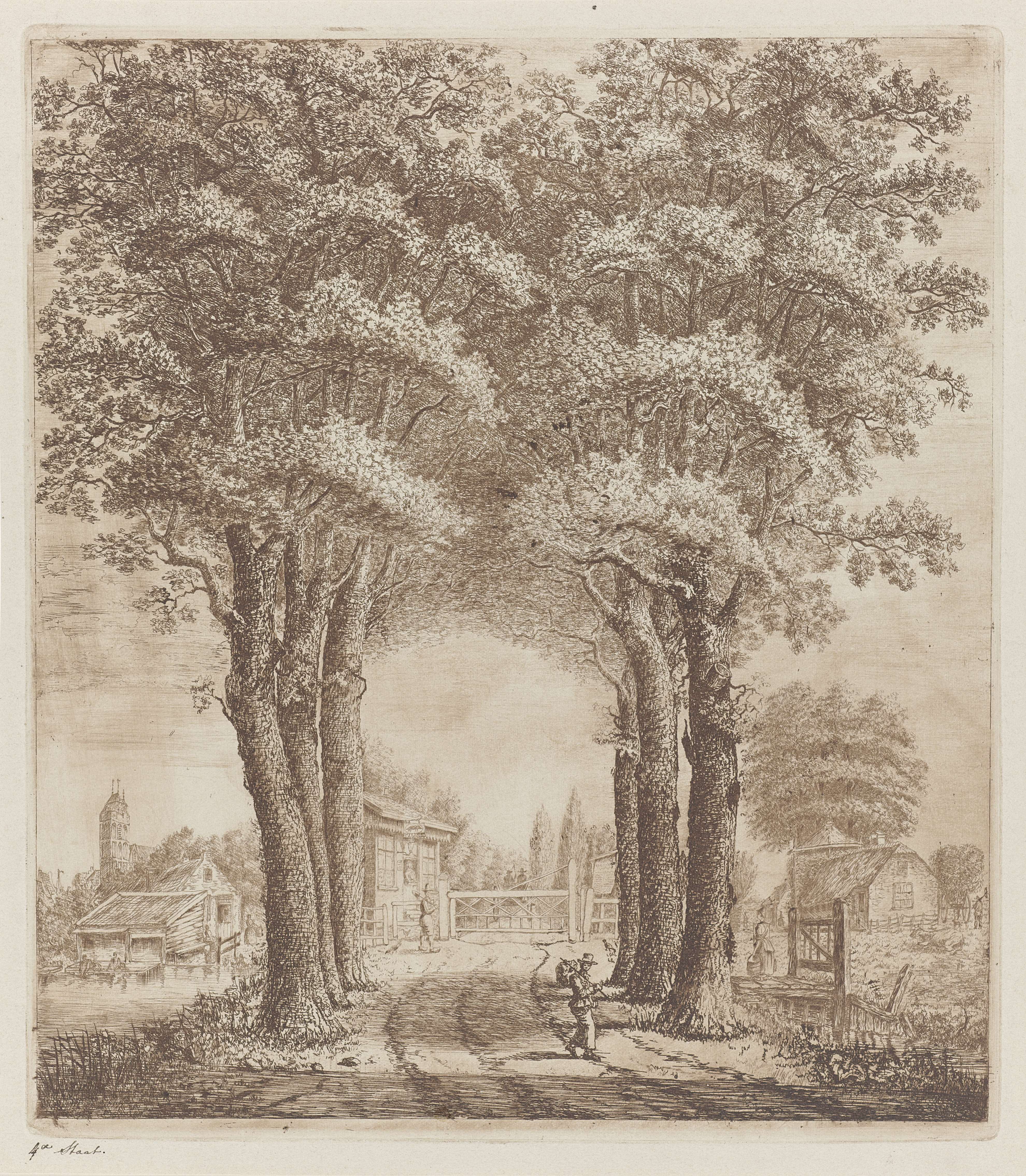 Hoge bomen en huisjes langs pad