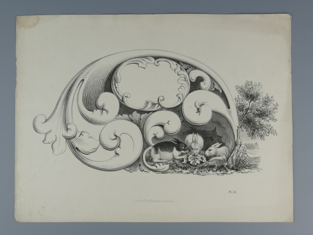 Litho, voorstellende floraalmotief met landschap en ...