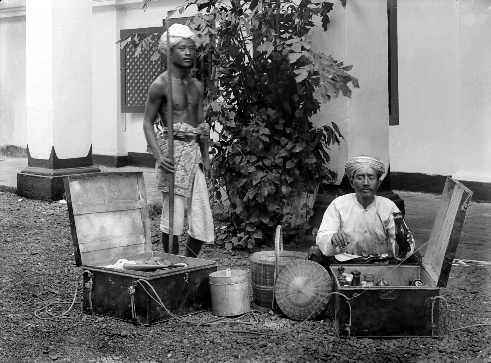 Portret van een twee Javaanse koekverkopers bij het ...