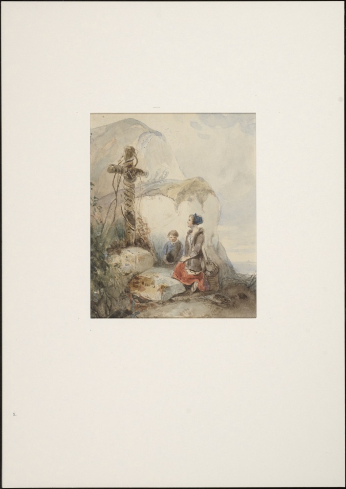 Vrouw knielend voor kruisbeeld