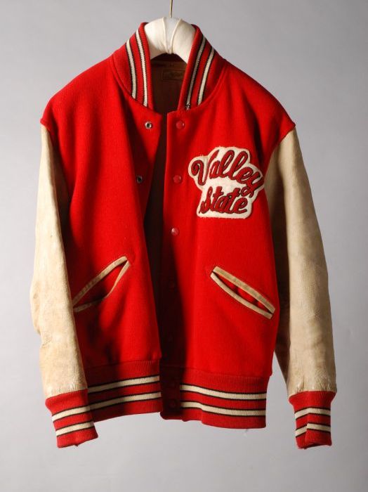 Rood wollen baseballjack met leren mouwen, met "Vall...