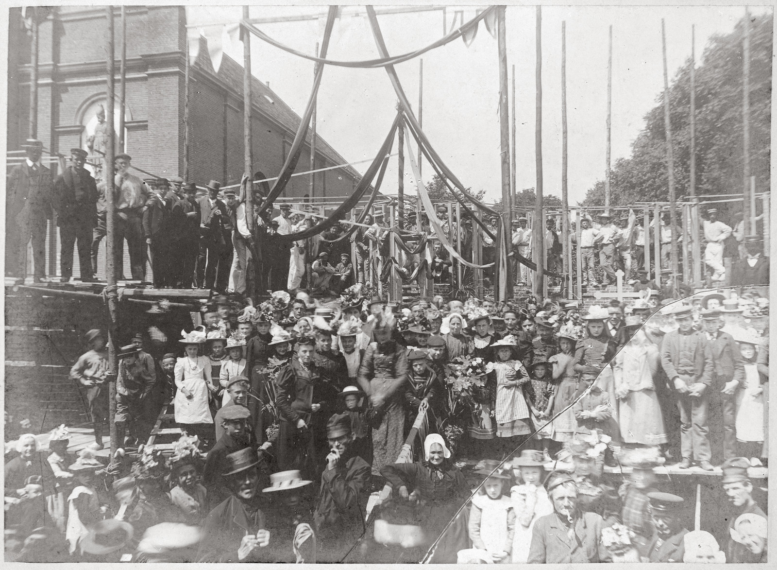 Plaatselijke bevolking bij de waterstaatskerk te Lan...
