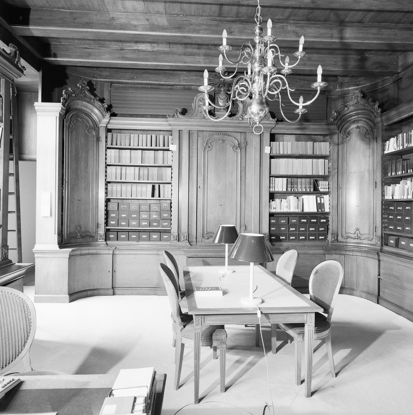 Interieur van het Van de Perrehuis, overzicht biblio...