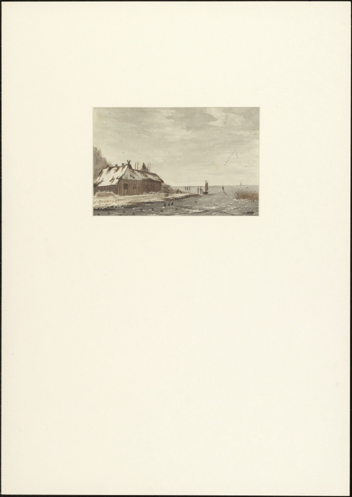 Gezicht op oever met mand, palen en riet