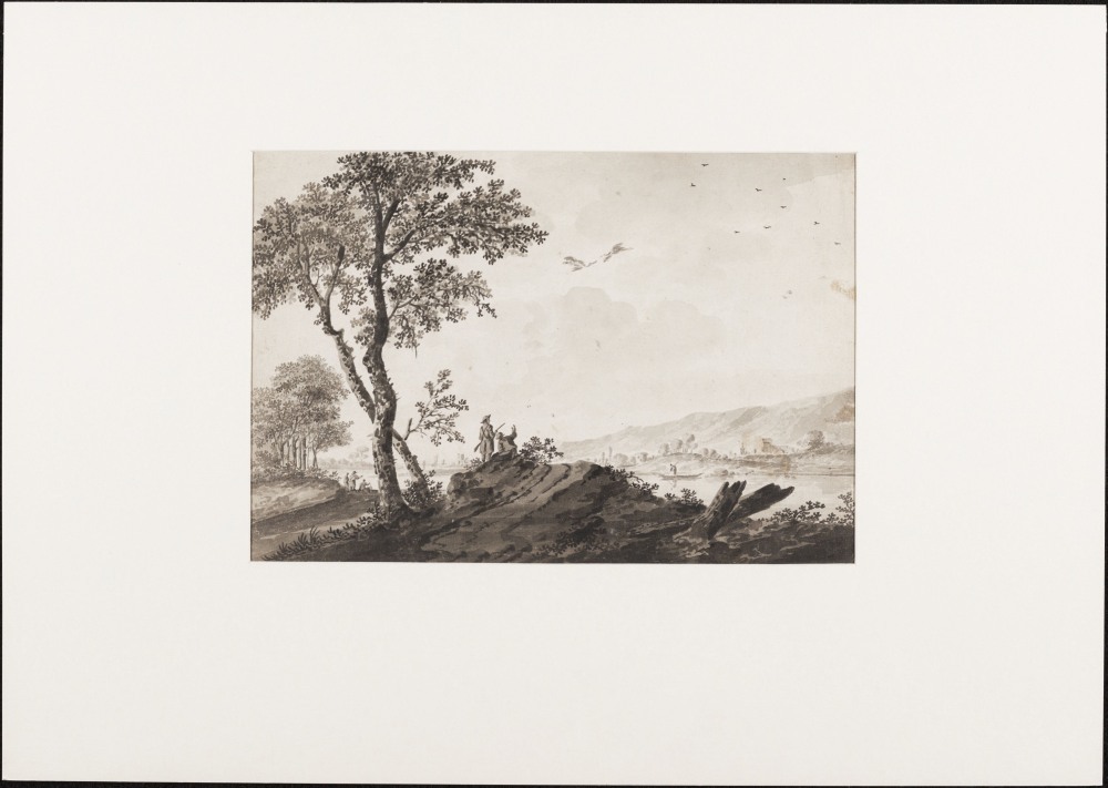 Riviergezicht met schepen en hoge oever