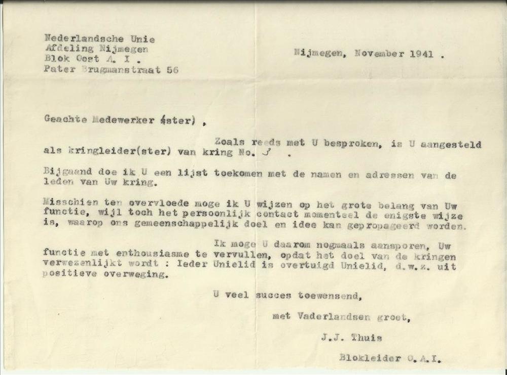 Brief van de Nederlandsche Unie afdeling Nijmegen aa...