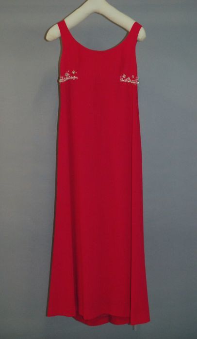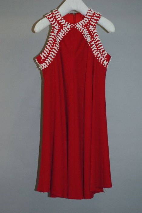 Rood wollen mini-halterjurk met wit kralen borduursel