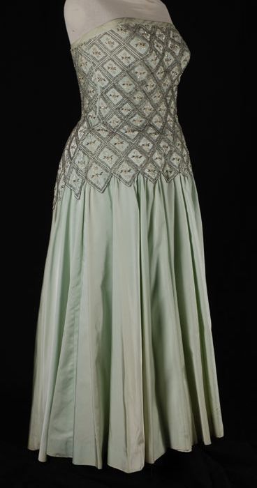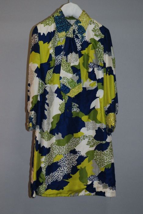 Zijden japon met borduursel, blauw, wit, groen, grijs