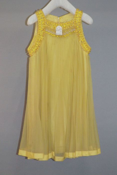 Gele, mouwloze jurk in A-lijn, lijfje bezet met kralen
