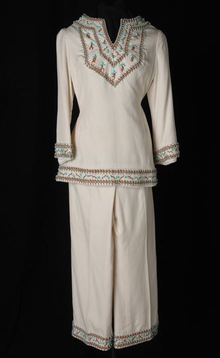 Crèmekleurig zijden broekpak met kralenborduursel