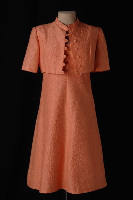 Beigeroze mantelpakje met bontkraag en strassknopen