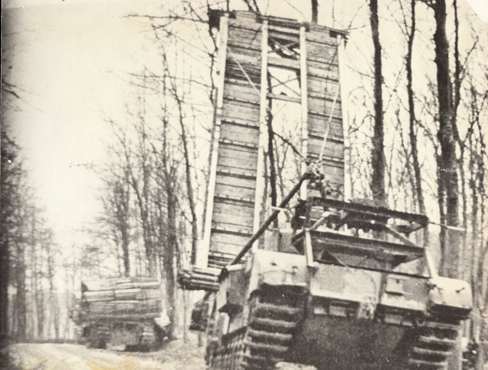 Foto van een Churchill Mk III Bridgelayer (voorgrond...