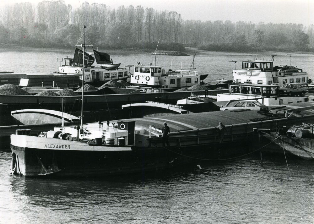 Zwart-wit foto van binnenschepen op de Rijn te Tolka...