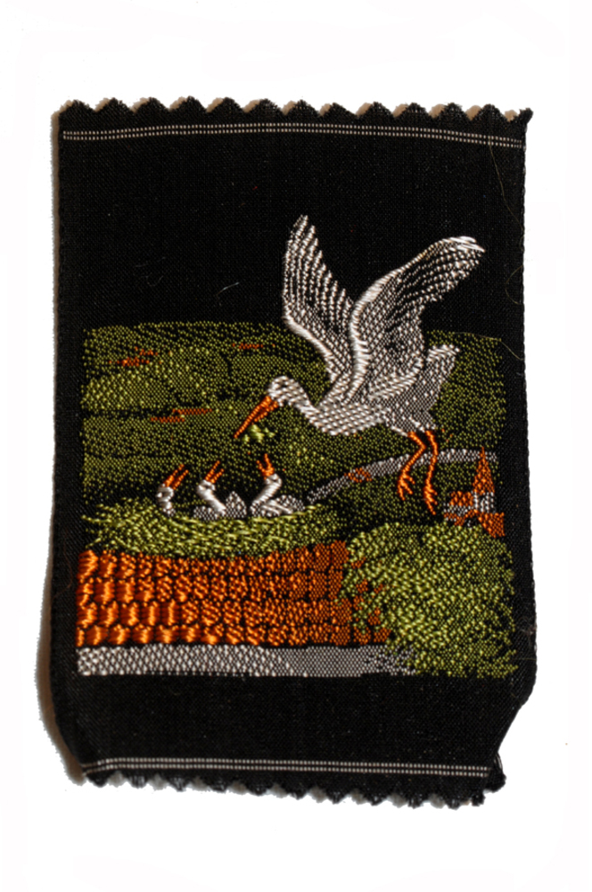 Zijdje 'Ooievaar voedt haar jongen' textiel, uitgege...