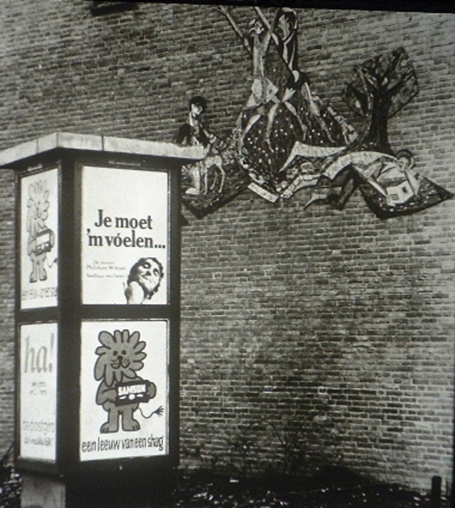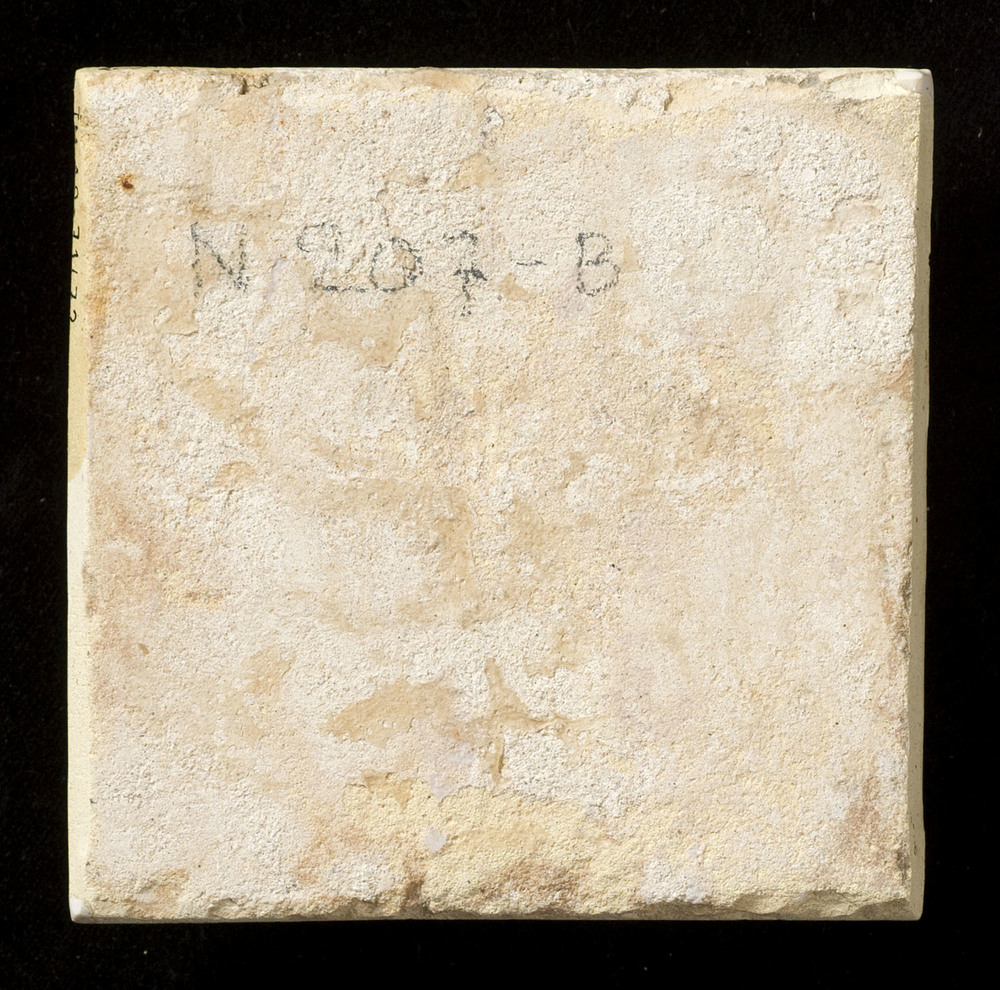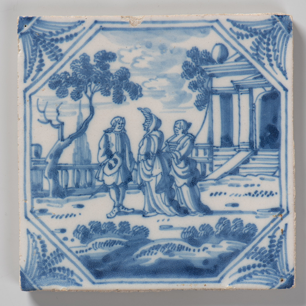 Tegel van keramiek met tinglazuur, voorstellende: De...