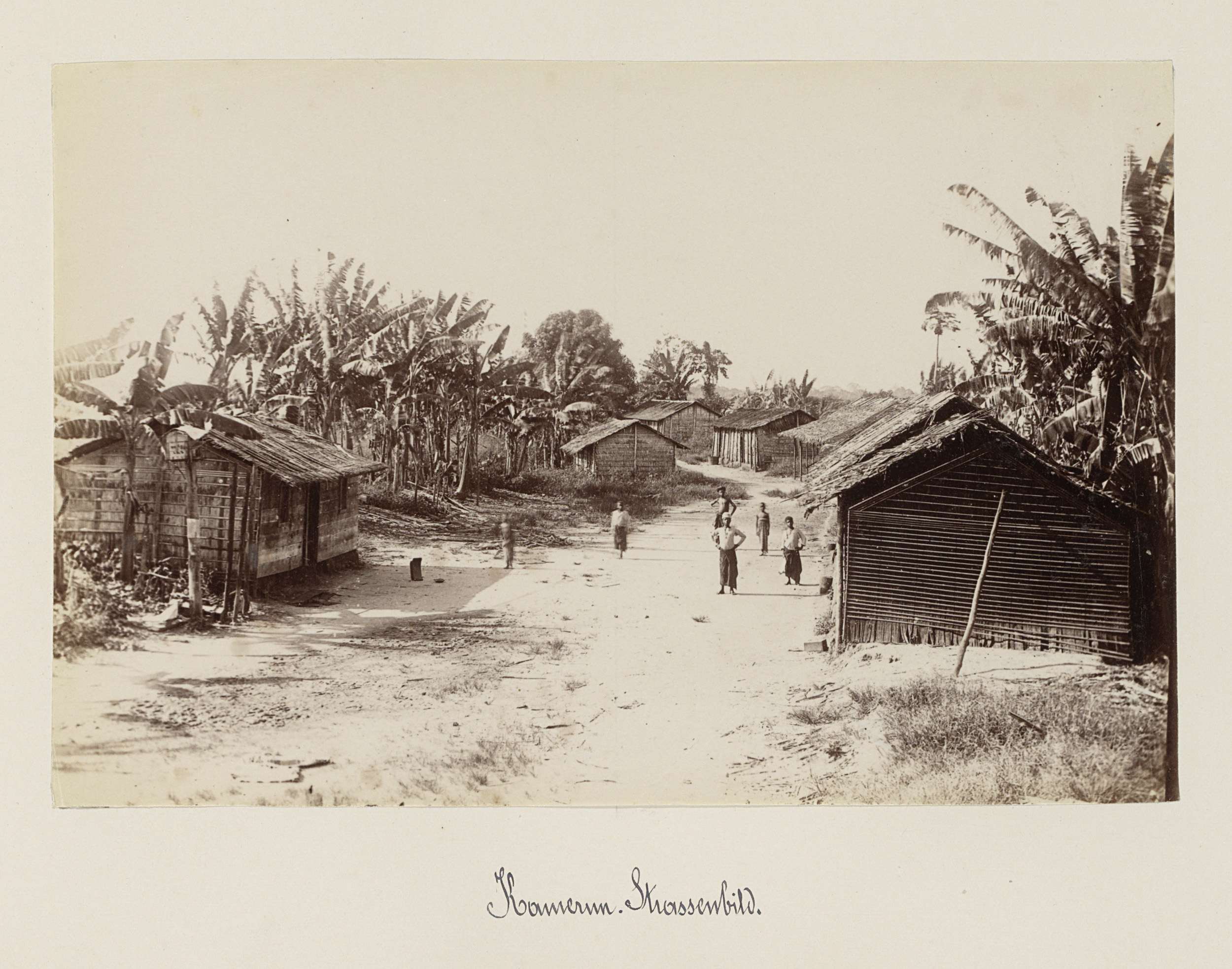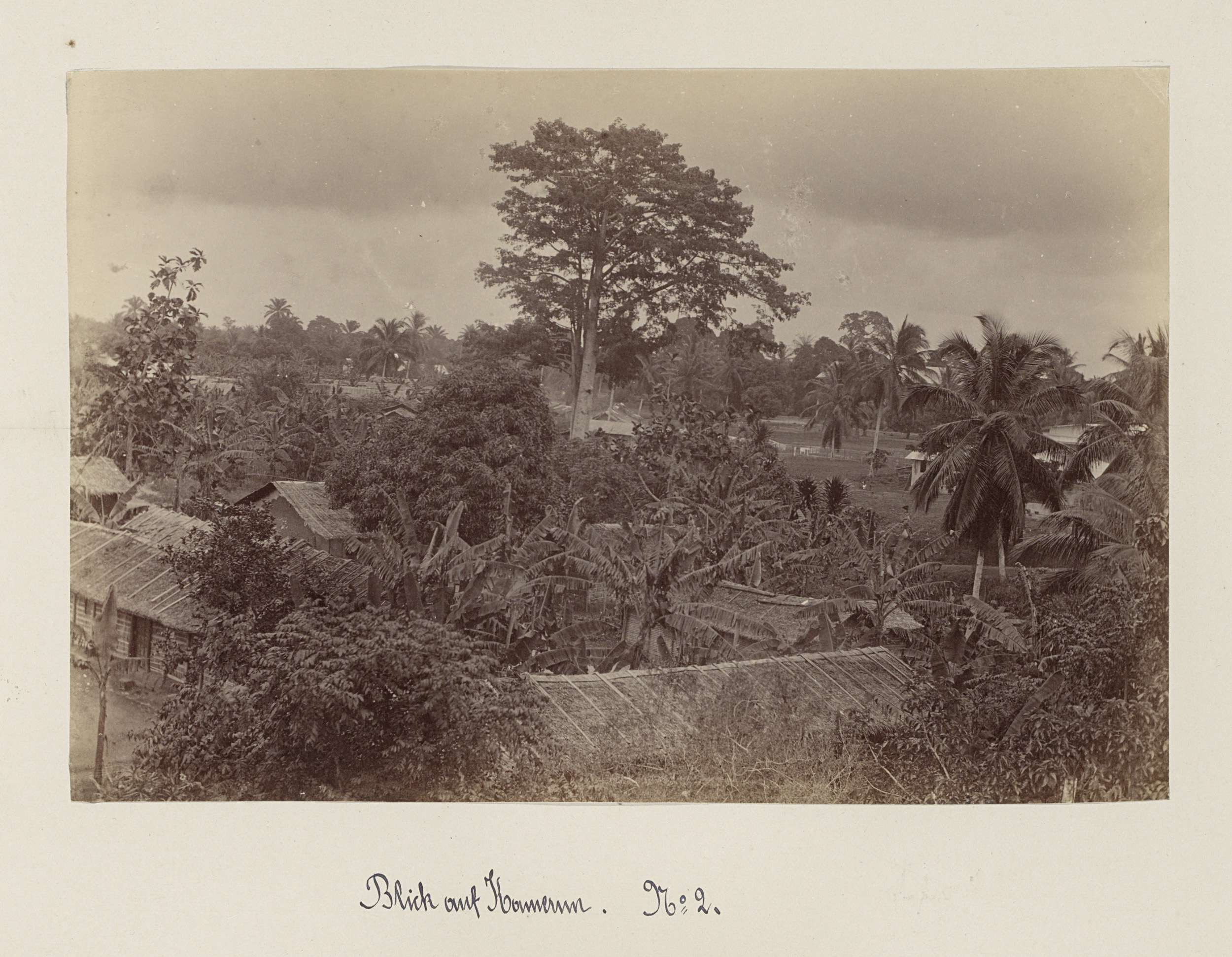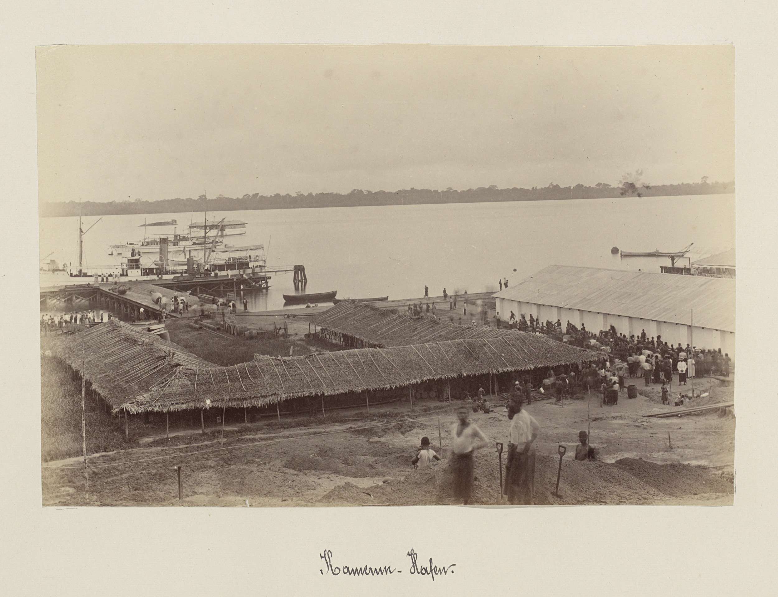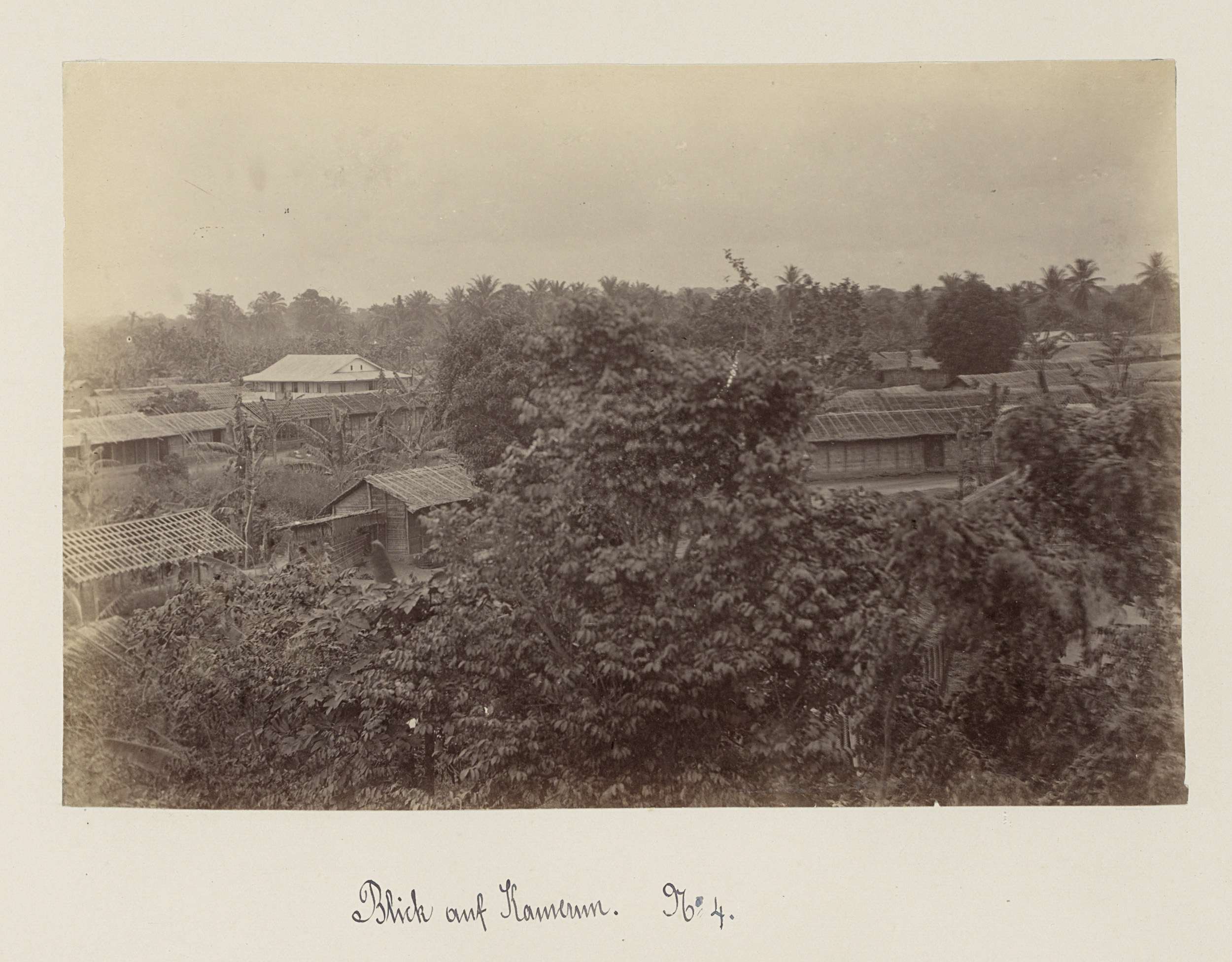 Handelsnederzettingen in Kameroen, gezien vanaf de r...